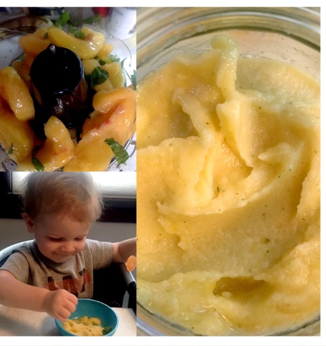 One small bag of frozen peaches, 1/2 cup of honey, squeeze of lemon, one basil leaf  (chopped) and 1/2- 1 cup of water. Place all ingredients into a food processor. Add more water if needed. Blend to perfection. Serve on side of a cutie pie.